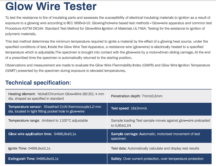 the Glow Wire Test Apparatus, a resistance wire (glow-wire) is electrically heated to a specified temperature which is adjustable.The specimen is brought into contact with the glow-wire by a motor-driven sliding carriage. At the end of a prescribed